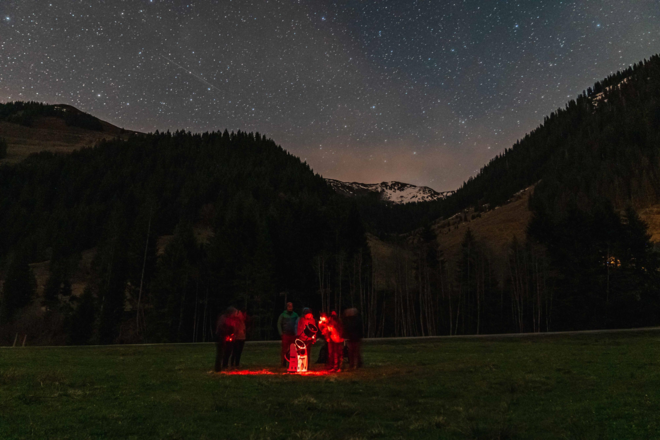 Bei der Glücks-Sterndl-Wanderung wandern wir von Gasteig ein kurzes Stück hinauf in den Bereich der Bacheralm, wo wir es uns auf der Almwiese mit mitgebrachten Isomatten und Decken unter dem dunklen Sternenhimmel gemütlich machen werden.