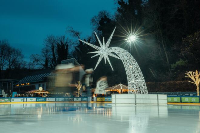 Das Adventparadies, direkt an der Eisfläche gelegen und sogar mit Schlittschuhen begehbar, verwöhnt mit hausgemachtem Punsch, Glühwein, Kakao sowie einer Auswahl an Streetfood und süßen Delikatessen.