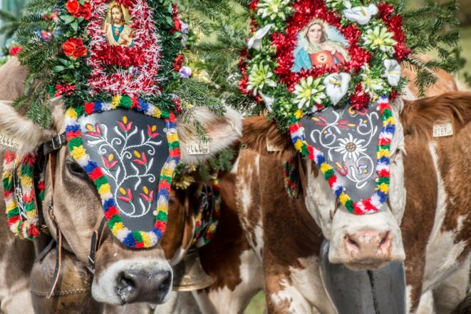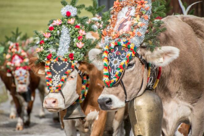 Zwischen 09.00 Uhr und 14.00 Uhr treiben die Bauern ihre geschmückten Kühe in Richtung Heimat.