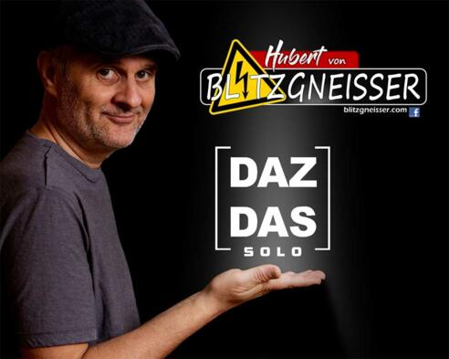 Nach fast 15 Jahren im Duo stellte sich Hubert Fellner die Frage: DAZ DAS solo? (Übersetzung: Würdest du auch alleine auf der Bühne stehen wollen). Ja natürlich war die Antwort und im 6. Blitzgneisserprogramm darf man sich wieder auf erdig-hinterfotzig-geistreichen Humor aus dem Hausruck freuen, auf skurrile Figuren mit vielen Geschichten aus dem Leben und natürlich auf Lieder mit Ohrwurmgarantie. „DAZ DAS“ heißt das erste Soloprogramm von Hubert v. Blitzgneisser und versteht sich als „Typenkabarett mit der Extraportion Musik“.