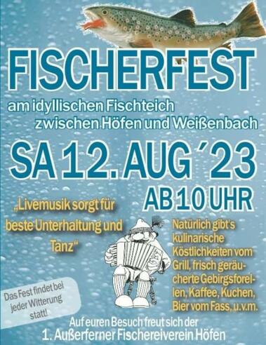 Beginn um 10:00 Uhr / Es spielt eine Live-Musik / Auf euch warten kulinarische Köstlichkeiten vom Grill, frisch geräucherte Gebirgsforelle, Kaffee, Kuchen, Bier vom Fass und vieles mehr / Das Fest findet bei jeder Witterung statt! Wir freuen uns auf zahlreiches Erscheinen!