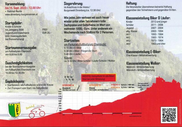 Start: Sportplatz Ehenbichl um 09:15 Uhr für E-Biker - 09:30 Uhr für Biker - 09:40 Uhr für Läufer