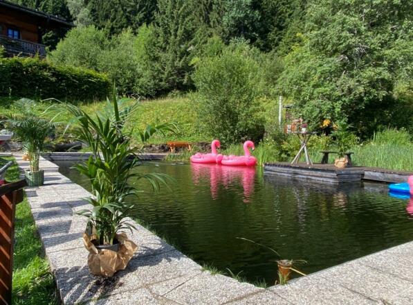 von 12.00 - 22.00 Uhr draußen mit Badespaß, Palmen, Alm-Strand, Flamingos und BBQ am Biotop.