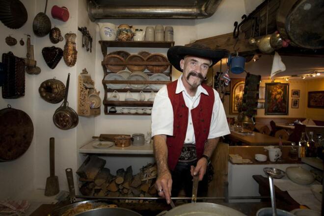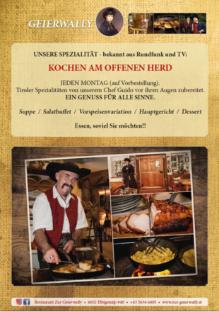 Ein besonderes Erlebnis, und weithin bekannt, ist das „Kochen am offenen Herd“. In der Gaststube befindet sich ein großer Holzherd umgeben von alten Pfannen. Mit viel Schwung und Witz führen wir Sie durch das mehrgängige Menü, nebenbei bekommen sie hier noch einen kleinen Lehrgang des Lechtaler Dialekts. Dies ist wahrhaftig Erlebnisgastronomie.