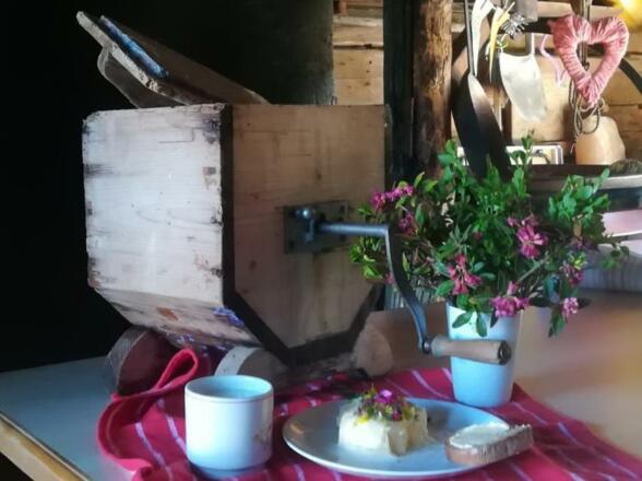 Ganz wie früher werden wir in einer urigen Almhütte von Hand selber Butter erzeugen. Traditionell gestampft in einem Butterfass, entsteht aus Sahne köstliche Butter, die wir anschließend verkosten werden.