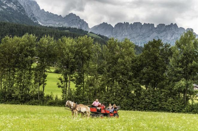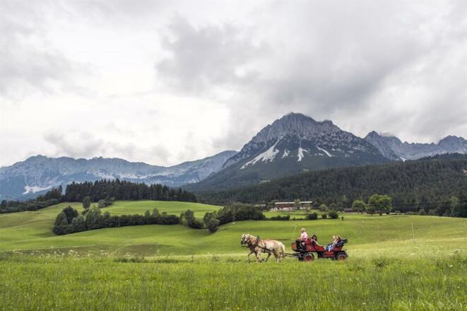 Mit den eingespannten Pferden geht die Tour vom Achlhof (in der Nähe der Hartkaiserbahn) vorbei an einem versteckten Drehort des Bergdoktors bevor wir beim Mühlberghof einkehren (nicht im Preis enthalten) und den herrlichen Blick auf den Wilden Kaiser genießen. Danach geht es wieder gemütlich zurück zum Ausgangspunkt.