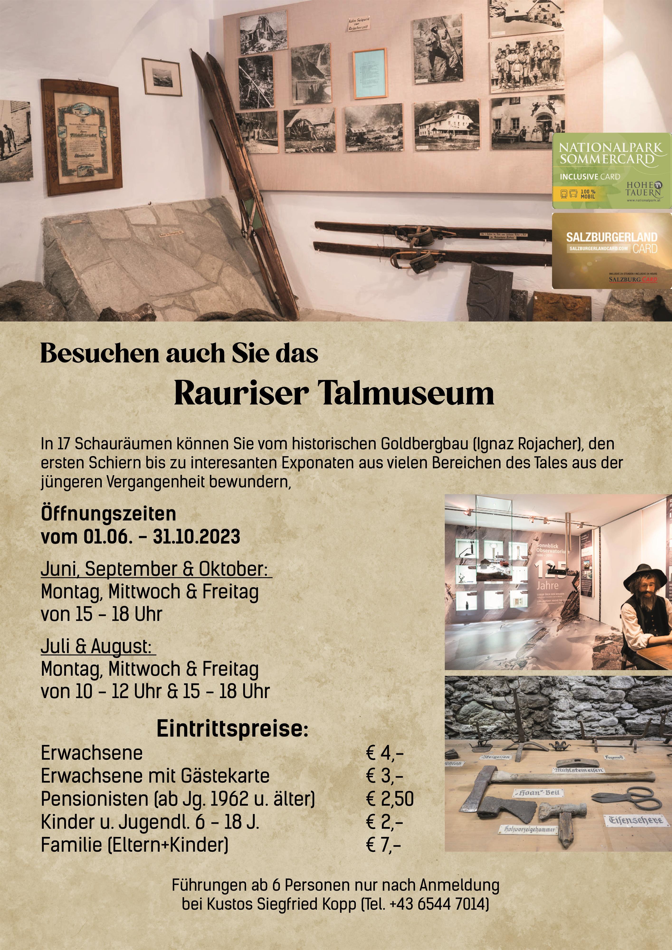 Preis: Erw. € 4,- , Erw. mit Gästekarte € 3,- , Pensionisten (ab Jg. 1962 und älter) € 2,50, Kinder u. Jugendliche 6 - 18 Jahre € 2,- , Familie (Eltern + Kinder) € 7,- ; Mit der Nationalpark Sommercard & der Salzburgerland Card kostenlos. Führungen (ab 6 Personen) jederzeit nach Voranmeldung bei Kustos Siegfried Kopp ( Tel.: +43 6544 7014 oder +43 6544 6253).