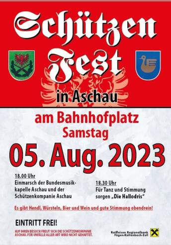 18.00 Uhr Einmarsch der BMK Aschau und der Schützenkompanie. 18.30 Uhr für Tanz und Stimmung sorgen "Die Halodris". Eintritt frei.