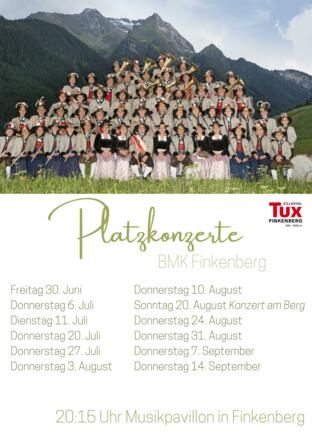 Die Platzkonzerte der Bundesmusikkapelle Finkenberg finden donnerstags (außer 11.07. Dienstag und 20.08. Sonntag) um 20.15 Uhr beim Musikpavillon in Finkenberg statt.