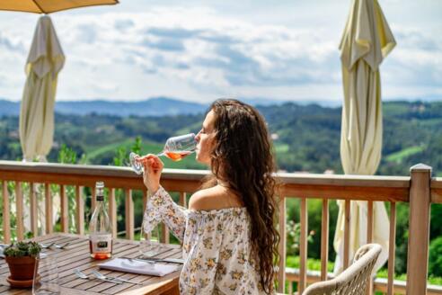 Sundowner auf der Terrasse am Jaglhof mit DJ Beats, coole Drinks, kulinarische Köstlichkeiten sowie einen wunderschönen Blick auf die Südsteiermark.