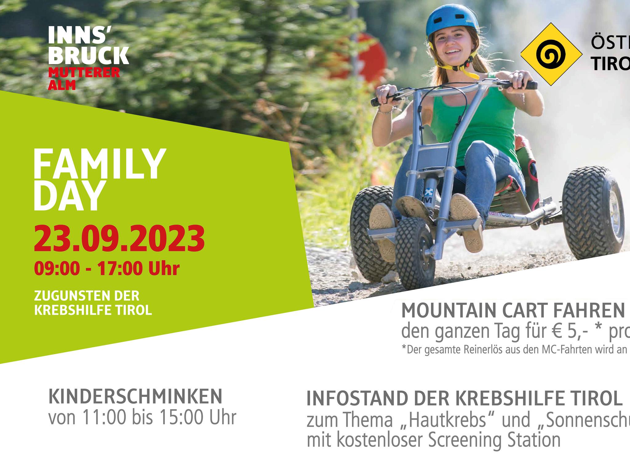 • Mountain Cart-Fahren zum Sondertarif! An diesem Tag gilt ein Sondertarif für € 5,- pro Fahrt & Cart. Der gesamte Reinerlös wird an die Tiroler Krebshilfe übergeben.