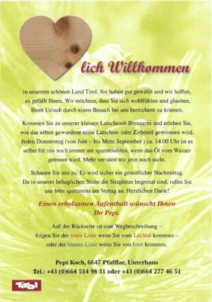 Kommen Sie zu unserer kleinen Latschenöl-Brennerei und erleben Sie, wie das selten gewordene reine Latschen- oder Zirbenöl gewonnen wird. Jeden Donnerstag ca. 14.00 ist es selbst für uns noch immer am spannendsten, wenn das Öl vom Wasser getrennt wird. Mehr verraten wir jetzt noch nicht.