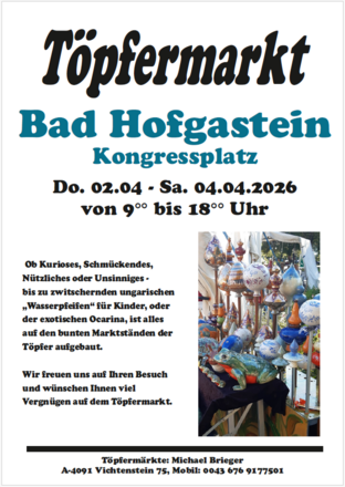 Von der Skulptur über verzierte Töpfe bis hin zu Keramikschmuck und Zimmerbrunnen, lässt sich auf dem Töpfermarkt in Bad Hofgastein eine unerschöpfliche Formenvielfalt bestaunen, die aus dem wunderbaren Element Erde entstanden ist:
