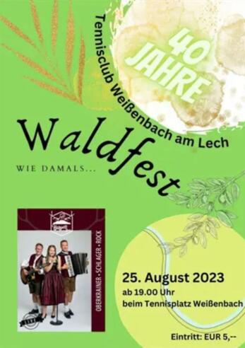 Eintritt 5,00 € / Start um 19:00 Uhr / Der Tennisclub Weißenbach feiert sein 40-jähriges Bestehen mit einem Waldfest am 25. August 2023. Für musikalische Unterhaltung sorgt "Hargott mit Linda" / Wir freuen uns auf euer Kommen!