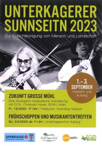 Freitag 1. 9. 2023 Performance "ZUKUNFT DES WASSERS, ZUKUNFT DER GROSSEN MÜHL" - anläßlich 10 Jahre Asphaltackern, Vortrag und Geigenwanderung in Kooperation mit Klimabündnis O.Ö. Musik: Trommelgeiger mit special guest Günter Wagner und angefragt HG Gutternigg.
