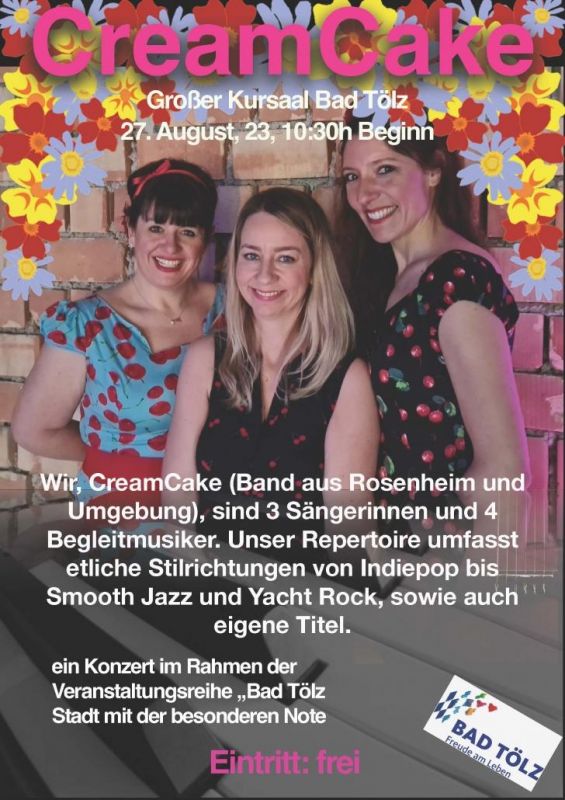 Wir, CreamCake (Band aus Rosenheim und Umgebung), sind 3 Sängerinnen und 4 Begleitmusiker. Unser Repertoire umfasst etliche Stilrichtungen von Indiepop bis Smooth Jazz und Yacht Rock, sowie auch eigene Titel.Ein Konzert im Rahmen der "Stadt mit der Besonderen Note".