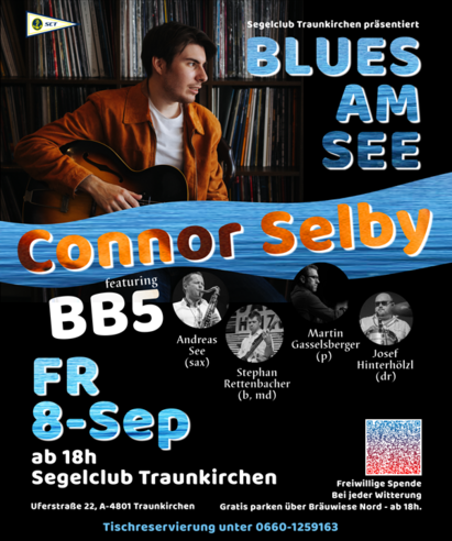 Auf der Terrasse des Segelclubs Traunkirchen (bei Schlechtwetter im Lokal) treten am Freitag, den 8. September ab 19 Uhr Musiker auf, die man sonst nur auf Festivals und in Clubs findet: Der britische Blues- und Soulmusiker CONNOR SELBY kommt mit außergewöhnlicher Begleitband ins Salzkammergut – den BB 5.