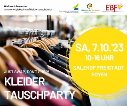 Viele Kleidungsstücke liegen oft ungetragen im Schrank. Um diese wertvollen Ressourcen zu nutzen und nicht zu verschwenden, veranstaltet der Energiebezirk Freistadt am Samstag, 7. Oktober 2023, von 10.00 bis 16.00 Uhr eine Kleidertauschparty im Foyer des Salzhof Freistadt.