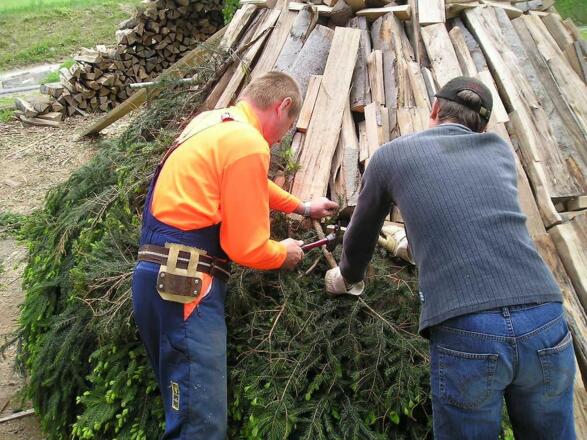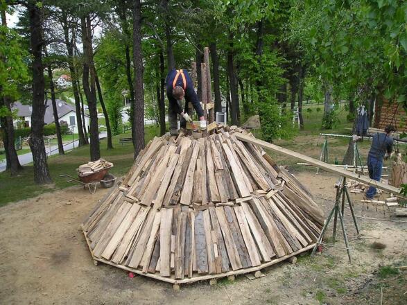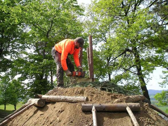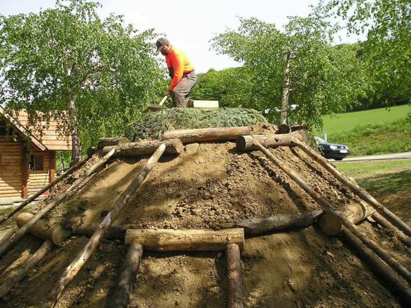 25. -26. August: Aufbau des Meilers – dabei werden 16m³ Holz kegelförmig aufgeschichtet und mit Erde bedeckt.