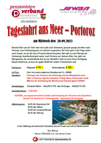 Diesmal führt uns die Fahrt über den Loibl nach Slowenien, genauer gesagt ans Meer nach Portoroz, eine Frühstückspause ist natürlich vorgesehen. Die Fahrt geht in der Folge weiter nach Stanjel, wo wir die Stara Prsutana Komel besuchen. Dort gibt es eine Führung mit Verkostung. Anschließend geht weiter nach Portoroz zur Gostisce Ribic, hier gibt’s ein Mittagsmenü, die anschließende Zeit bis zur Heimfahrt steht zu eurer freien Verfügung.