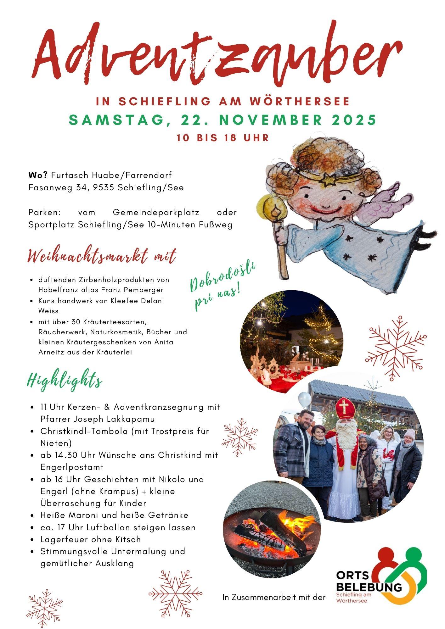 Weihnachtsmarkt mit kunstvollem Weihnachtsschmuck, Kränzen und Dekorationen von Kleefee Delani Weiss; duftenden Zirbenholzprodukten von Hobelfranz alias Franz Pemberger; über 30 Kräuterteesorten, Räuchermischungen, Kerzen, Büchern und kleinen Kräutergeschenken von Anita Arneitz aus der Kräuterlei