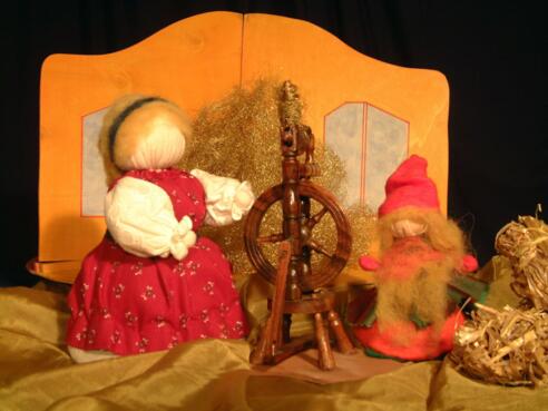 Es war einmal ein Müller, der war arm, aber er hatte eine schöne Tochter. Nun traf es sich, dass der Müller mit dem König zu sprechen kam, und um sich ein Ansehen zu geben, sagte er zu ihm: "ich habe eine Tochter, die kann Stroh zu Gold spinnen." Der König sprach zum Müller, "das ist eine Kunst, die mir wohl gefällt. Wenn deine Tochter so geschickt ist, wie du sagst, so bring sie morgen in mein Schloss, da will ich sie auf die Probe stellen.“ Als nun das Mädchen zu ihm gebracht ward, nahm er sie mit auf sein Schloss und führte sie in eine Kammer, die lag ganz voll Stroh, gab ihr Rad und Haspel und sprach „jetzt mache dich an die Arbeit, und wenn du diese Nacht durch bis morgen früh dieses Stroh nicht zu Gold versponnen hast, so musst du sterben.“ Darauf schloss er die Kammer selbst zu und sie blieb allein darin.