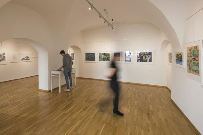 „ʹFloatingʹ heißt im Fluss sein, in der Zeit und dem Raum abzutauchen, neue und alte Räume öffnen und zwischen den Techniken und Medien hin und her zu wechseln. Ausgehend vom Holzschnitt zur Zeichnung, und wieder zurück. Zuerst war die Skizze, die Idee, der Entwurf, mit dem Farbölholzschnitt in die Farbe aber auch in die dritte Dimension. So wird aus einer linearen Zeichnung, durch eine bildhauerische Tätigkeit, eine malerische Komponente, die Zeichnung zur Farbe. Die verschiedenen Ebenen der Arbeit werden sichtbar, spürbar auch durch die Finger an der Oberfläche. Es ergeben sich Polyperspektiven. Aber auch die Bezugnahme zu den Künstlerinnen und Künstlern des Ateliers de La Tour, deren Farbigkeit übernommen wird.“ (Birgit Bachmann) Als Träger und Symbol für ʹFloatingʹ präsentieren Christian Gurker, Harald Rath und Peter Smoley ihre ʹWasserbilderʹ in der Technik des verlorenen Druckes, der Pastellölkreide sowie der Tusche und Tuschstift auf Papier.