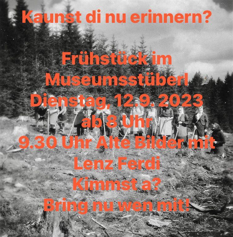 Im Museumsstüberl gemeinsames Frühstück ab 8 Uhr und wenn alle fertig gefrühstückt haben, zeigt unser geschätzter Heimatforscher Ferdinand Lenz alte Bilder zu einem Thema - auf eine Leinwand projiziert.