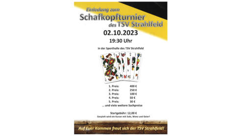Einladung zum Schafkopfturnier des TSV Strahlfeld in der Sporthalle des TSV Strahlfeld1. Preis 400€2. Preis 250€3. Preis 100€4. Preis 50€5. Preis 30€... und viele weitere SachpreiseStartgebühr 12,00 €Gespielt wird ein Kurzer mit Solo, Wenz und Geier!