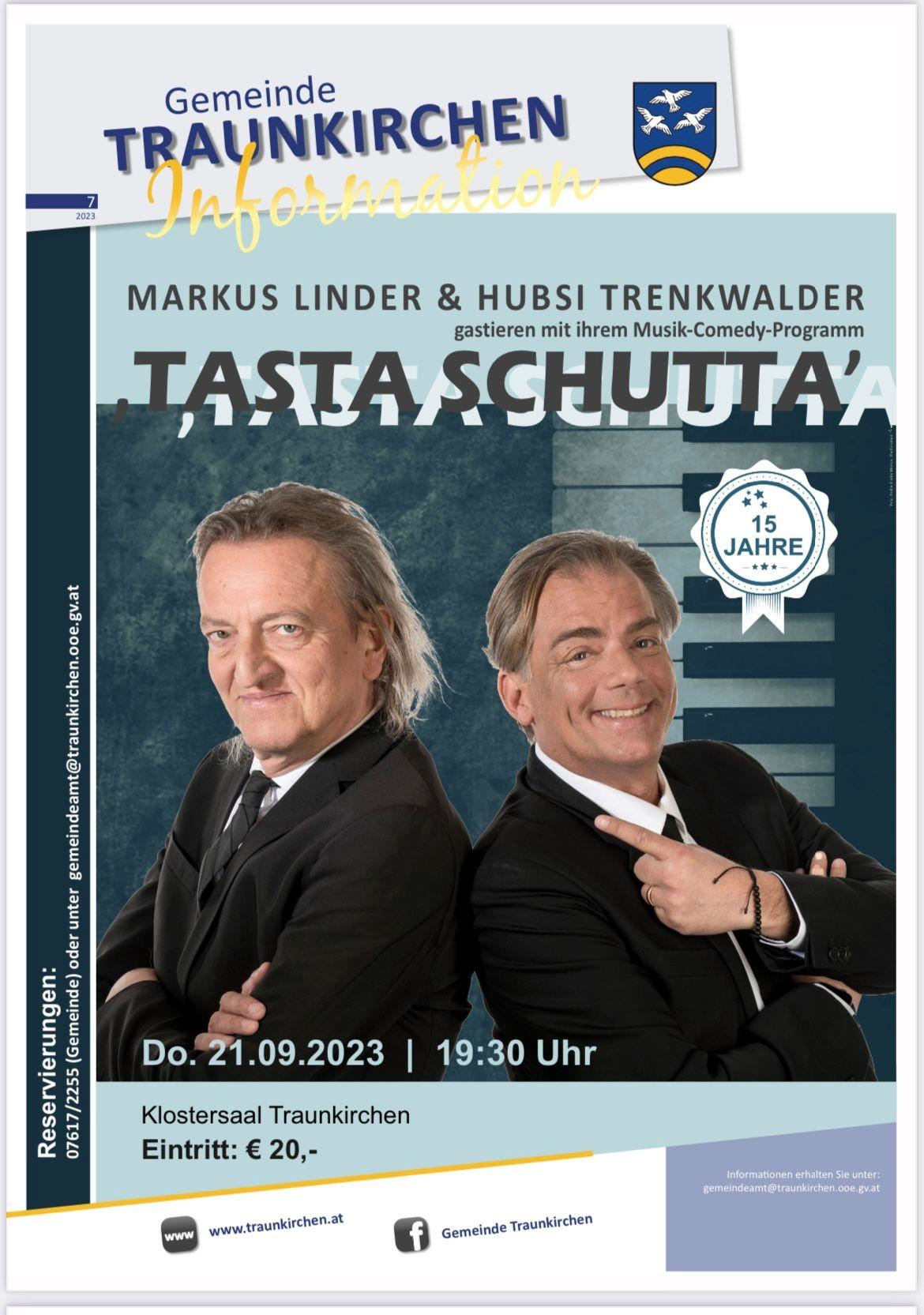 Markus Lindner & Hubsi Trenkwalder gastieren mit ihrem Musik-Comiday-Programm "Tasta Schutta" im Klostersaal Traunkirchen.