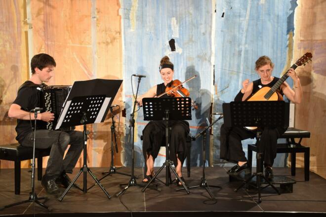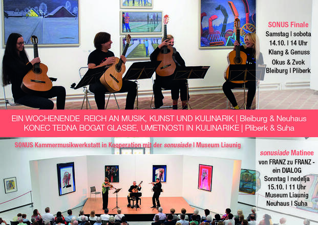 Wir starten mit einem Glas Sekt und einer Schaumtüte zur Begrüßungsmusik beim Stöckl, danach folgt die fachkundige Führung im Werner Berg Museum begleitet mit Musik der Teilnehmerinnen und Teilnehmer der diesjährigen im Sommer durgeführten SONUS- Kammermusikwoche. Den krönenden Abschluss bildet um 16.00 Uhr ein festliches mehrgängiges Abendessen im Brauhaus Breznik, bei dem zwischen den Gängen erlesene Kammermusik serviert wird. Die beiden SONUS-Dozentinnen Mira Gregorič an der Violine und Sara Gregorič an der Gitarre bilden mit dem jungen und hervorragenden Akkordeonisten Paul Schuberth ein kongeniales Trio und wir dürfen uns neben Bekanntem auf erfrischende Eigenkompositionen freuen – ganz im Sinne der 18. SONUS-Kammermusik