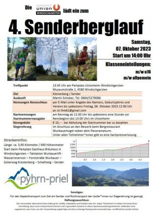 Die Sportunion Windischgarsten veranstaltet am Samstag, 07. Oktober 2023 den 4. Senderberglauf mit Start um 14.00 Uhr. Die Strecke weist bei einer Länge von 3,90 Kilometer 690 Höhenmeter auf, und führt vorwiegend auf Forststraßen und Wanderwegen vom Ortszentrum von Windischgarsten über den Wurbauerkogel und den Schafsteig auf den Kleinerberg (Sender). Anmeldungen vor Ort sind bis eine Stunde vor Rennbeginn möglich.