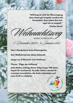 Der Weihnachtsweg führt euch über eine Strecke von etwa 8 Kilometern und besteht aus sechs sorgfältig gestalteten Stationen, die euch helfen, die Botschaft der Hoffnung neu zu entdecken. Der beschilderte Weg beginnt bei der Wanderkarte beim Klostergarten und endet in der Wallfahrtskirche Maria Schmolln. Ausgedruckte Wegbeschreibungen findet ihr am Start oder ihr scannt die Route mittels QR Code. Die Weg lädt dazu ein, alleine, mit Freunden oder mit der Familie zu gehen, und bietet Raum für stille Momente, tiefgehende Gespräche und gemeinsames Erleben.