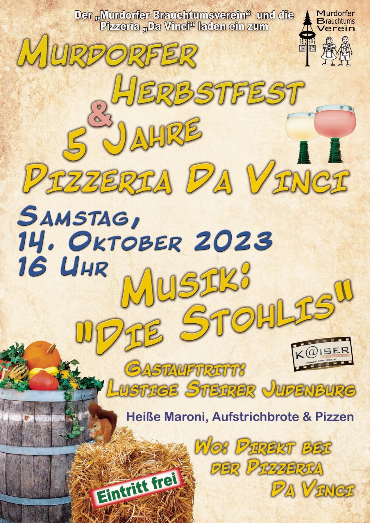 Am 14.10.2023 ab 16:00 Uhr laden der Murdorfer Trachtenverein und die Pizzeria Da Vinci zum Herbstfest ein. Im Zuge des Herbstfest wird auch 5. Jahre Pizzeria gefeiert.