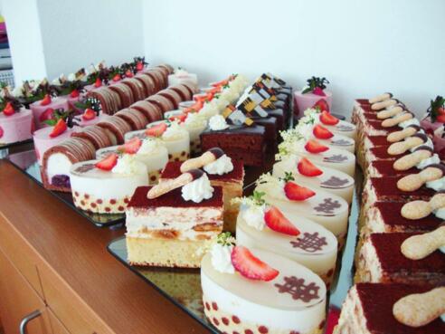 Herstellung und Verwendung von Dekorbiskuit, versch.-farbigen Cremes, Frucht(gelee)einlagen, etc..