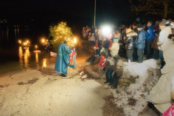 Lichterweg zum Strandbad am Obertrumer See und traditionelles Christbaumtauchen. Die Taucher der Seehamer Wasserrettung tauchen einen Christbaum aus dem eisigen Wasser des Obertrumersees. Anschließend werden mit einer Fackel symbolisch die Lichter des Dorfchristbaumes entzündet. Die Bläsergruppe der Trachtenmusikkapelle Seeham umrahmt diesen festlichen Akt am Gelände des Adventbasars rund um den Schmiedbauerstadl.