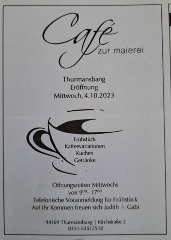 Cafe´zur MaiereiJeden Mittwoch von 9-17 Uhr geöffnetFrühstück, Kaffeevariationen, Kuchen, GetränkeTelefonische Voranmeldung für Frühstück (Tel. 0151-53512518)Auf ihr Kommen freuen sich Judith + GabiWo: Bei der "Maierei", Kirchstraße 2 in Thurmansbang