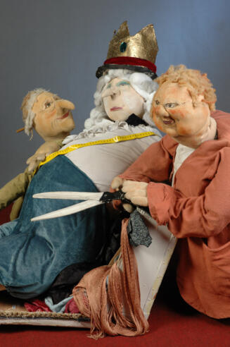 Die beiden Spitzbuben machen sich an die Arbeit, nähen aber nicht, sondern tun so als ob. Überschwänglich nehmen sie Maß, fuchteln mit Webstuhl, Schere und Nadel in der Luft herum, zeigen schließlich auf den leeren Tisch und rufen: »Seht, die Kleider sind fertig!«