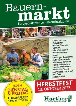 Die Bauernmarkt-Standler laden am Freitag, den 13. Oktober von 12 bis 17.30 Uhr zum Herbstfest beim Europaplatz mit diversen Speisen und Getränken. Vor Ort sind auch einige Kunsthandwerker, die wunderschöne Produkte verkaufen. Kommen Sie vorbei!