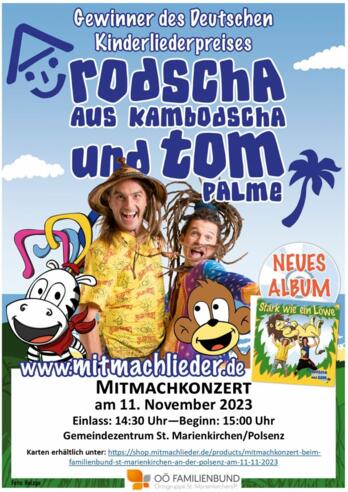 um 15 Uhr ein Kinder-Mitmachkonzert mit Rodscha aus Kambodscha und Tom statt.