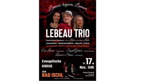 Seit mehr als 26 Jahren, bietet das „LEBEAU-TRIO“ ein Repertoire von klassischen Chansons bis hin zu Chansons der Gegenwart. In der Besetzung Gesang, Gitarre, Klavier und Akkordeon präsentiert das Trio seine eigenen lebendigen Interpretationen und Arrangements zu Chansons von Linda Lemay, Claude Nougaro, Jacques Brel, Georges Brassens, Serge Lama, Edith Piaf, und anderen.