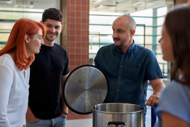 Das Package inkludiert: Bier brauen mit Brau-Expert*innen, Verkostungsbox und Verkostungsglas für Zuhause, Brauereirundgang, geführte Verkostung, Verpflegung