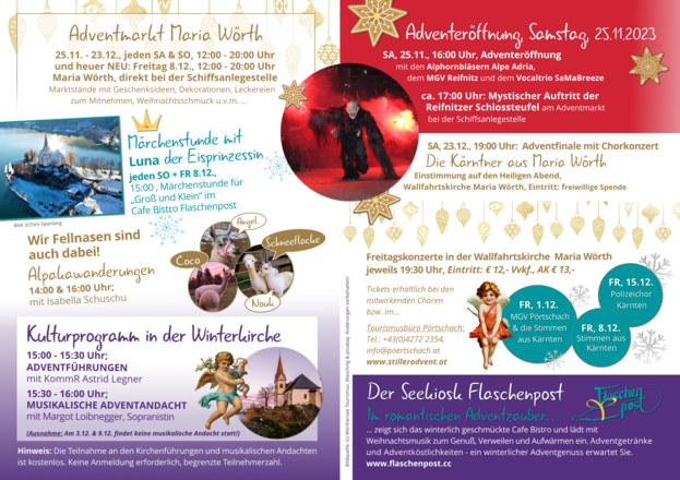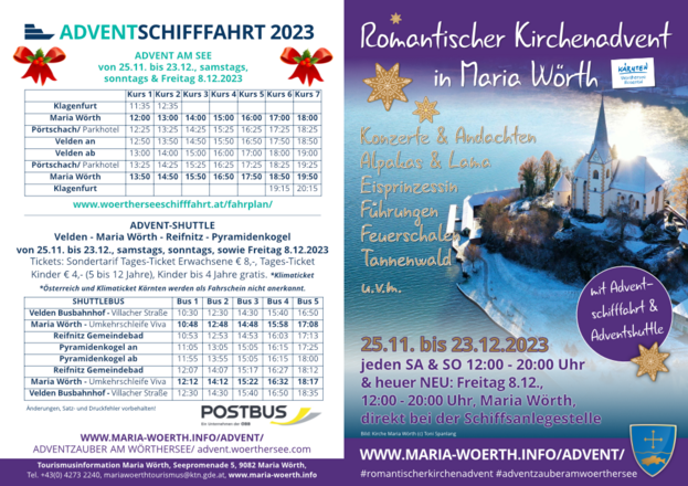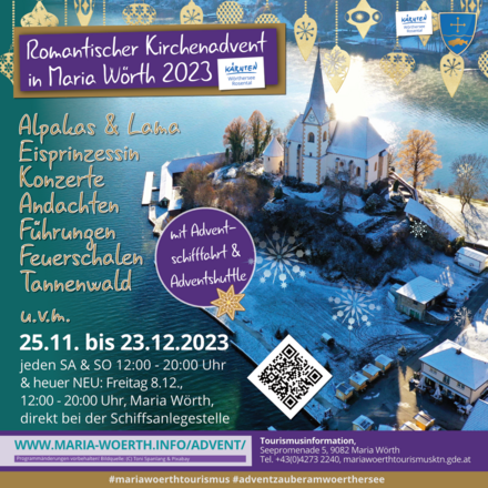 25.11.2023 - Adventeröffnung/ + 2., 16. & 23.12.2023; 16:30 Uhr: Musikalische Darbietungen - Vocaltrio SaMabreeze – Adventmarkt beim Schiffsanleger 26.11., 3., 10., & 17.12.2023; 16:00 – 18:00 Uhr (+ 23.12.; 17:45 – 18:45 Uhr): „Drehorgelspieler“ Walter Alge – Adventmarkt beim Schiffsanleger 23.12.2023: 19:00 Uhr; Chorkonzert – Die Kärntner aus Maria Wörth – Wallfahrtskirche Maria Wörth, Eintritt: freiwillige Spende!