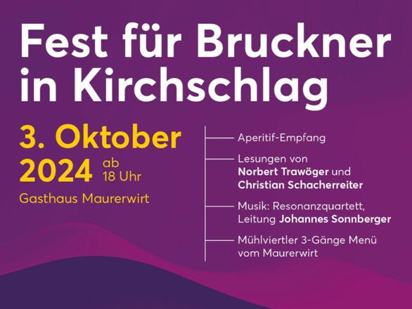 Zu Ehren von Anton Bruckner wird am 3. Oktober 2024 in Kirchschlag bei Linz ein Fest gefeiert, mit namhaften Gästen wie Norbert Trawöger, Christian Schacherreiter und Johannes Sonnberger. Freuen Sie sich auf inspirierende Lesungen und musikalische Darbietungen, sowie ein Mühlviertler 3-Gänge Menü vom Maurerwirt.