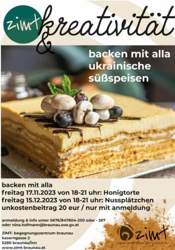 Backen mit Alla (ukrainisch/russischer Back-Workshop) Beim ersten Termin wird eine ukrainisch/russische Honigtorte gemacht und am zweiten Abend spezielle typische Nussplätzchen. Hier gibt es wieder einen Unkostenbeitrag von 20,-- Euro, um die Materialkosten zu bestreiten und der Workshop-Leiterin den Arbeitsaufwand zu entschädigen. Hier bitte unbedingt anmelden, begrenzte Teilnehmeranzahl.