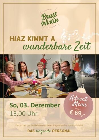 Gönnen Sie sich von der Hektik des Alltags eine Auszeit und lassen Sie von Barbara Bratl, Bratlwirtin von Heilbrunn, Ihren Gaumen mit einem köstlichen Advent Menü verwöhnen, während das „Singende Personal“ beim und zwischen dem Servieren mit Liedern aus aller Welt weihnachtliche Stimmung aufkommen lässt.