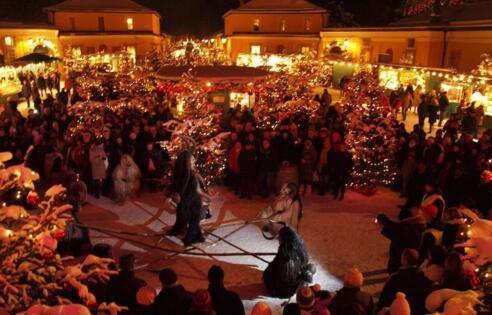 Traditioneller Krampuslauf im Rahmen des Hellbrunner Adventzaubers, mit Stangentanz vor der Schlosstreppe.