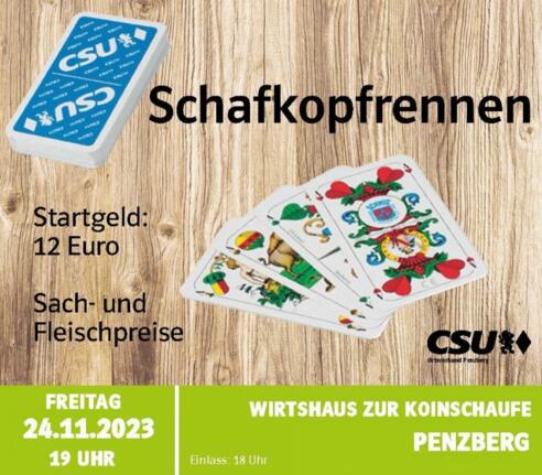 zum Schafkopfrennen der CSU Penzberg am Freitag, 24.11.2023 um 19:00 Uhr (Einlass: 18:00 Uhr) im Wirtshaus zur Koinschaufe.Startgeld: 12 Euro