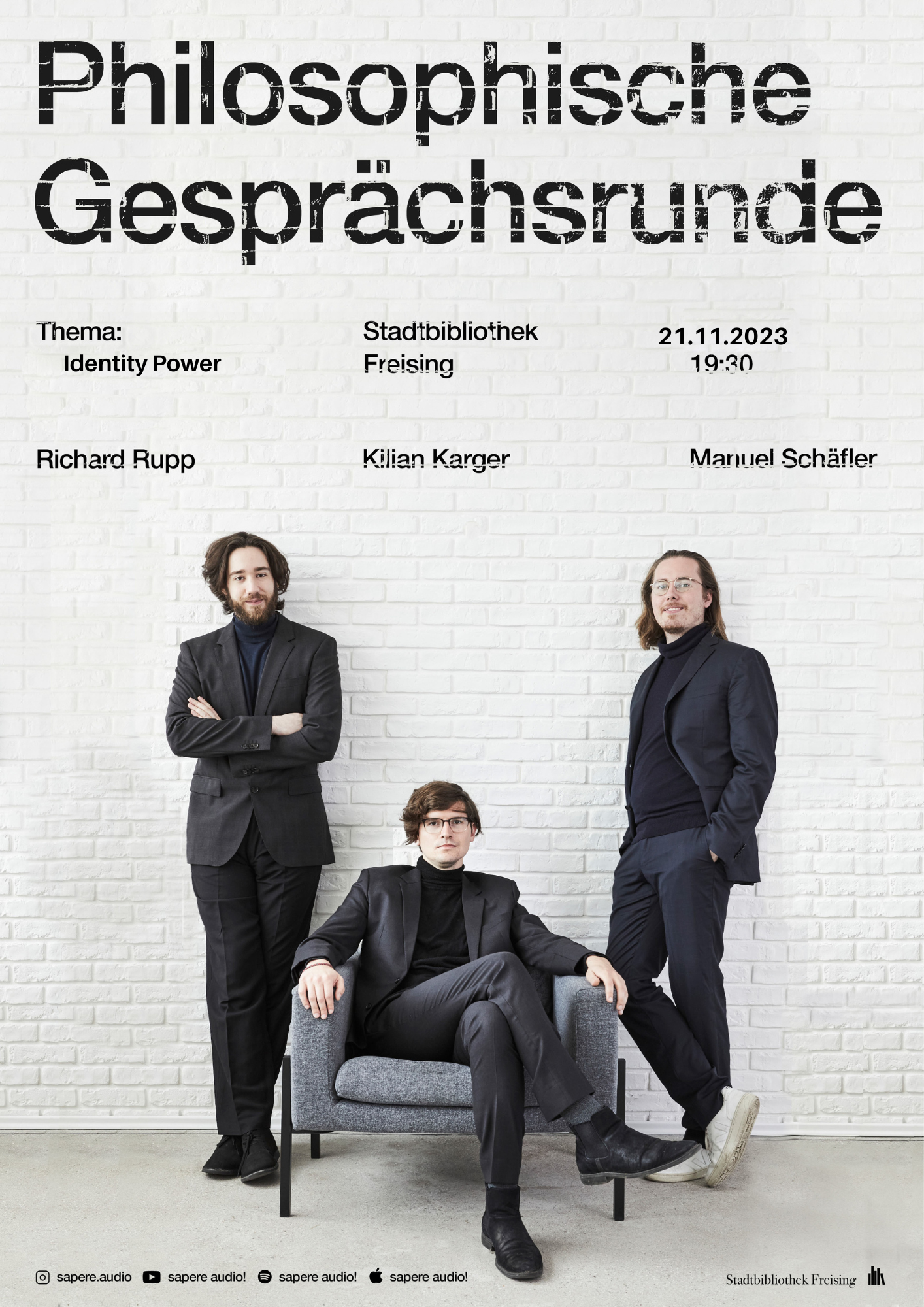 Gesprächskreis zu den großen und kleinen Fragen des Lebens unter dem Motto „Philosophie für alle“. Moderiert und mit einem kurzen Impulsvortrag eingeleitet werden die Veranstaltungen von drei jungen Philosophen. Mit ihrem Projekt „sapere audio“ möchten sie Philosophie für alle zugänglich machen.