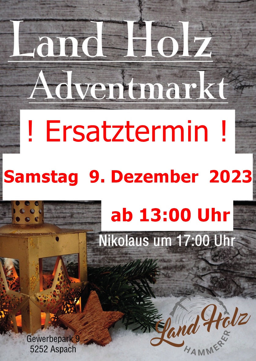 Gemeinsam mit der Feuerwehr Höhnhart freuen wir uns euch den Ersatztermin für unseren Adventmarkt am Firmengelände der Firma Land Holz Hammerer im Gewerbepark 9 in 5252 Aspach bekannt zu geben.